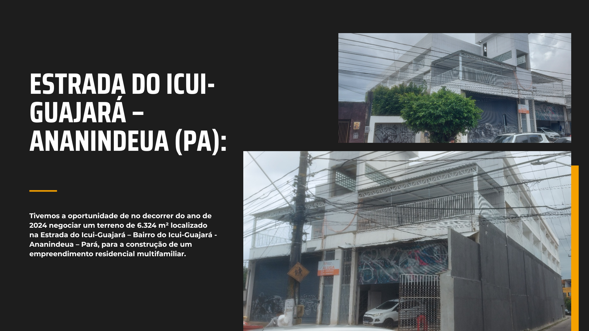Em 2024, a empresa alcançou um marco importante ao negociar um terreno de 6.324 m², localizado na Estrada do Icuí-Guajará, em Ananindeua (PA), destinado à construção de um empreendimento residencial multifamiliar, consolidando seu compromisso com o desenvolvimento urbano e a valorização de projetos que unem inovação, sustentabilidade e qualidade de vida.